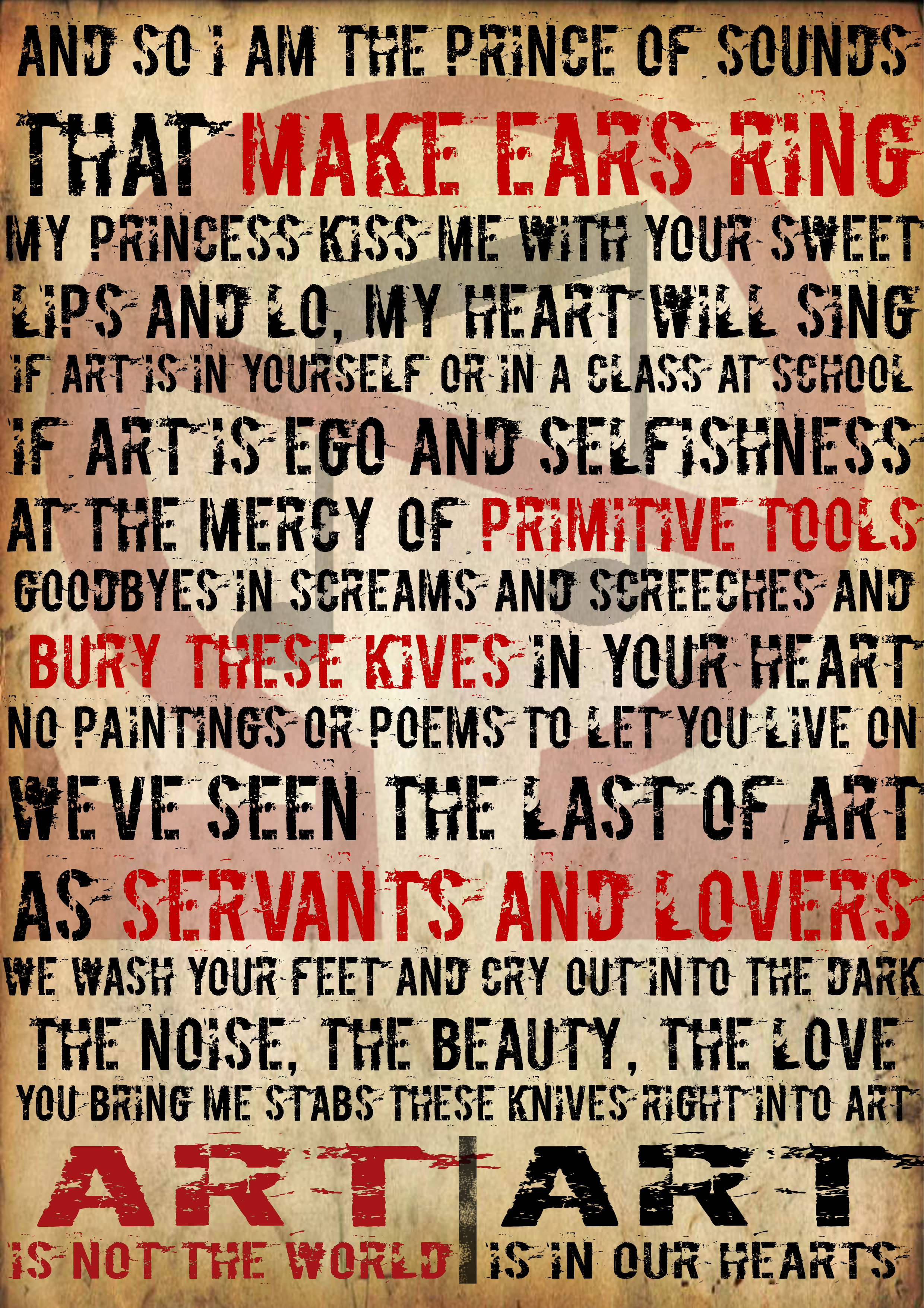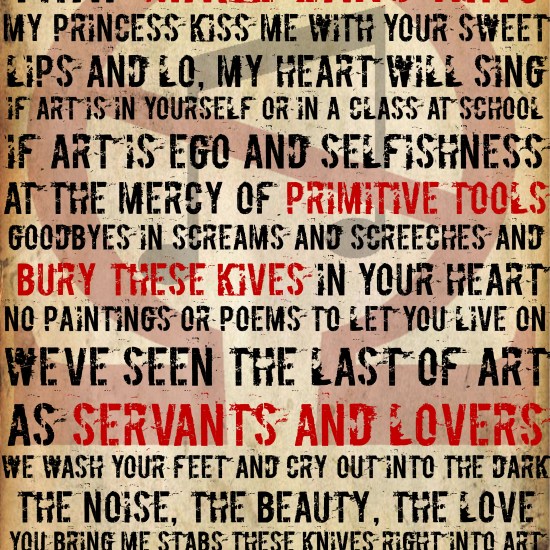 The first is a typographic poster using lyrics from Showbread’s “Stabbing Art to Death” (song included at the bottom).