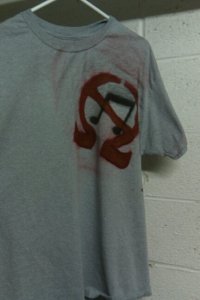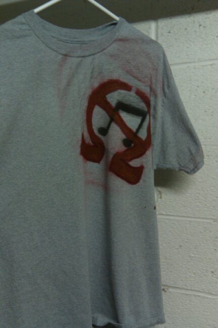 As part of today’s to-do list, here is my newest “RAW Rock” t-shirt, made on the same kind of t-shirt as the Basquiat design, stencil was designed and cut out the same way as all of the others, flat black spray paint for the music note, glossy red for the Omega symbol (gave it a weird hint of gold in the right light?)