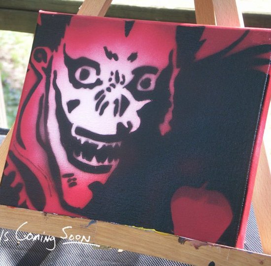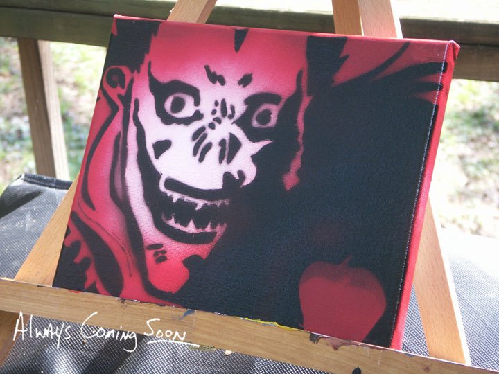 “Ryuk,” from the popular Anime-turned-live-action-film DeathNote is painted entirely with spraypaint on 8″x10″ canvas. Stencils were designed in Photoshop and hand-cut. He’s $50.00 + shipping and found on My Etsy Store.