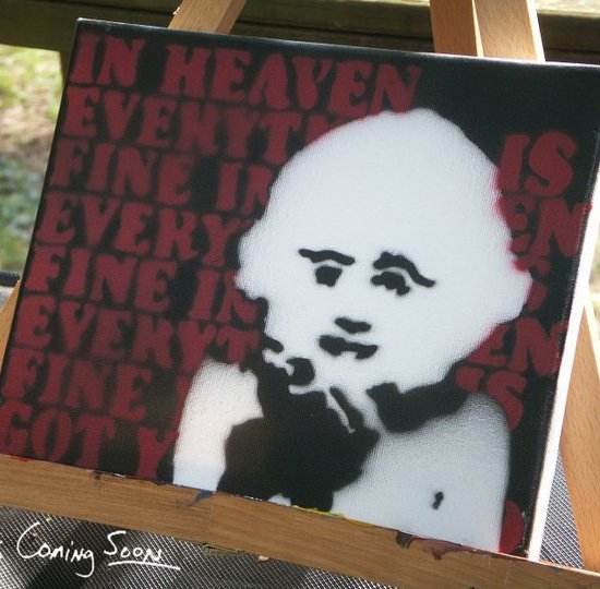 “In Heaven,” a portrait of the Lady in the Radiator from David Lynch’s totally bizarre film Eraserhead along with lines from her accompanying tune was also painted entirely with spraypaint and is also on 8″x10″ canvas. Again, stencils were designed in Photoshop and hand-cut. She’s $50.00 + shipping and found on My Etsy Store.