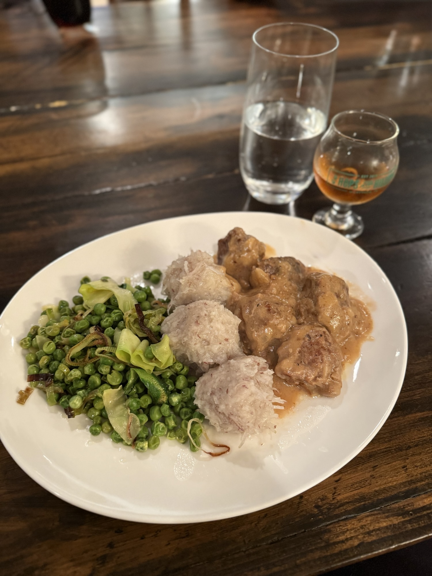 From there, the side dish of Raspeballer came out GREAT even though I was convinced I’d messed them up. The recipe calls for one part cooked-and-peeled potatoes (grated) to two parts raw potatoes (also grated) with the addition of barley flour, AP flour and salt. That part was easy enough, but the instructions say to make sure your water is simmering because coming to a full boil would cause your dumplings to fall apart. I did great, but at one point I had vegetables on one eye, brown sauce on another, these dumplings on a third and my meatballs going on the end. I was in the weeds and before I knew it, my dumplings were boiling. Thankfully I caught it and remedied the situation before I ended up with potato water soup.